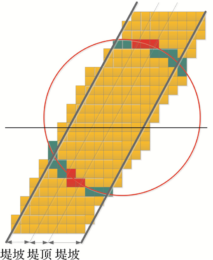 图 4是一段堤防示意图,堤顶区域高程较堤坡区域高,堤防中心线即是要从堤顶区域提取高程值最大的系列栅格点。如图 5所示,堤防“中间高,两侧低”的形态特征使得DTM中间区域网格高程高于边缘区。假定以一圆环覆盖于堤防上,并探测圆环穿过的所有DTM网格高程,查找高程值最大的栅格,基于堤防形态特征,可以确定该栅格单元是属于图 5位于堤顶区域的红色栅格。
