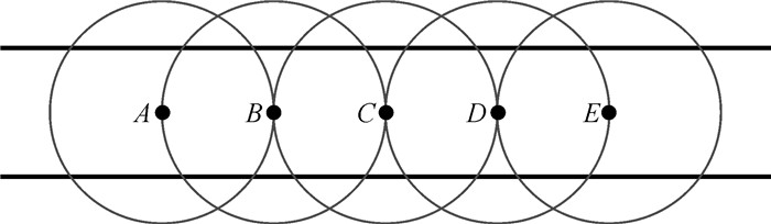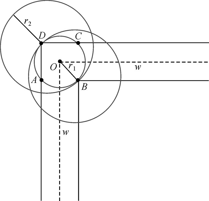 在堤防比较平直的区域,考虑到堤防因破坏发生形态变化时,会导致堤防中心点向堤防两侧偏移,最罕见的情形,堤防中心点(同时也是圆心点)位于堤防最外侧处,则必须满足r≥w,圆环才能覆盖堤防两侧。而在堤防弯曲较大的区域,如图 7所示,堤防近似直角弯曲,同样考虑比较罕见的情形,堤防中心点位于堤防最外侧的B点或D点,圆环若要完全覆盖堤防,则圆环半径r必须达到线段BD的长度,即满足