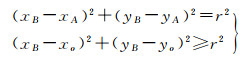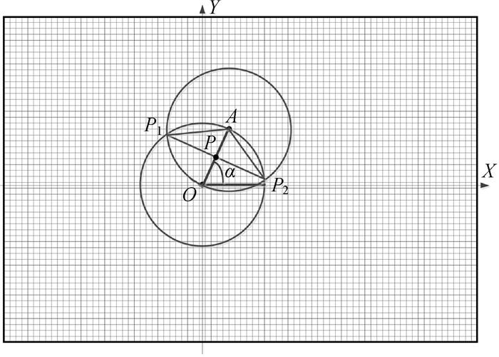 按照式(2)和式(3),查找圆O上所有离散点,找到高程值最大的点。如图 8所示,假定点A所在的DTM网格就是高程值最高网格,以点A为圆心,r为半径做圆,因为圆心点A所在的圆和圆心点O所在的圆半径都是r,则点A所在的圆必过点O。假定圆A和圆O相交于点P1和点P2,线段AO和线段P1P2相交于点P。要找到圆A上的某一堤防中心线上点B,则点B必须满足式(4)