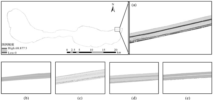因为在裁剪堤防DTM的过程中,堤防外侧一些农田等非堤防区域也包含在了堤防DTM中,在生成坡度图时,这些区域的坡度也涵盖在[0°, 8.43°]、[8.43°, 28.43°]坡度范围中。如图 9所示,在局部放大图中,位于堤防外侧的品红色图斑与堤顶图斑都属于坡度范围为[0°, 8.43°],该图斑实际上不是堤顶,是处于堤防外部的农田。因此,针对上述矢量化成果,需要剔除堤防外侧的这类图斑,以及坡度范围为[28.43°, 68.87°]的图斑,得到最终包含堤顶和堤坡的堤防形态矢量数据如图 9(e)所示。