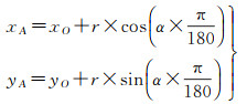 如图 8所示,以圆环中心点O为坐标原点,以水平方向为x轴,垂直方向为y轴,从x轴正方向上作为圆环第一个点开始,依次按照1度递增,形成圆环点集,共计360个点。那么,对点集中的A点而言,其与x轴正方向的角度α是已知的,设圆环中心O点的坐标为(xo, yo),则点A的空间坐标xA,yA满足式(2)