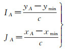 由于DTM网格宽度为c,假设DTM范围最小最大坐标为(xmin, ymin)、(xmax, ymax),则点A对应的DTM网格行列号IA,JA满足式(3)