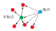 | 注:绿色实心圆圈为目标点,蓝色实心圆圈为噪声点,实线指向目标点邻域点,虚线指向噪声点邻域点。 图 2 互为最近邻方法 Fig. 2 Nearest neighbor method |