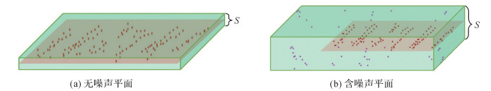 以平面为例(下同),假设数据集在容忍误差内没有噪声,其表现为更加紧凑,跨度S将会较小(图 3(a)),因此,在最优平面(图 3的红色平面)投影面积一定的情况下,每个点的占有平均体积较小。而在图 3(b)中,由于存在噪声且噪声往往分布较为分散,跨度S的增加使得每个点占有的平均体积明显增加。另外,噪声还有一个明显的特征是相较于内群点,其偏离最优平面的距离较大。