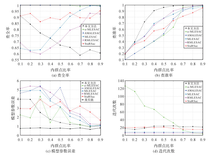 本文分别在查全率、查准率、模型参数误差(见式(8))和迭代次数4个方面与现有算法(MLESAC[12]、RMLESAC[19]、AMLESAC[20]、u-MLESAC[21]和StaRSac[23])进行对比分析