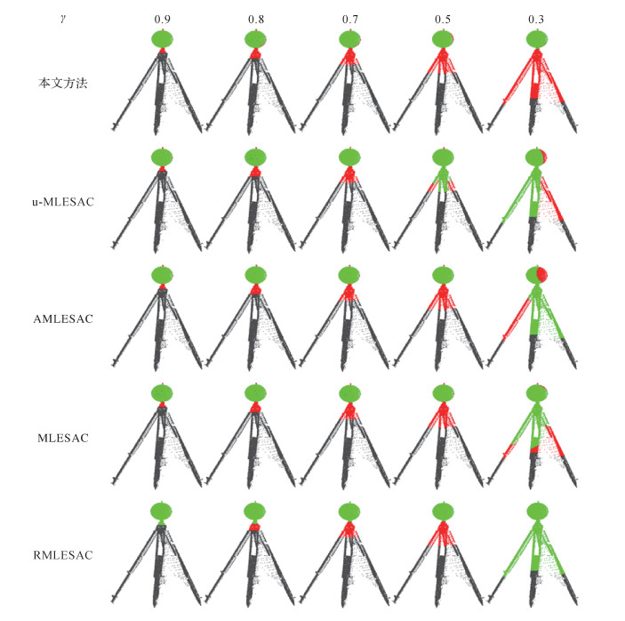 如图 6所示,本文方法能够剔除γ≥0.3点云中的噪声(三脚架和底座),当γ≥0.5时,AMLESAC和MLESAC算法表现与本文方法基本一致,但是,γ=0.3时,算法失败。u-MLESAC算法能够剔除γ≥0.7时的噪声,而RMLESAC算法无法剔除底座处的点云。需要说明的是,StaRSac算法稳健性较差,并且,对于数据量较大的点云,效率太低,没有用于对比试验。本文方法对于内群点(球形标靶)密度大于噪声(三脚架和底座)密度时,对γ有较好的稳健性,而其他方法对于γ更为敏感,即:γ<0.5,算法往往会失败。需要说明的是,图 6中的γ取值是一个粗略估计值,只用于定性分析。