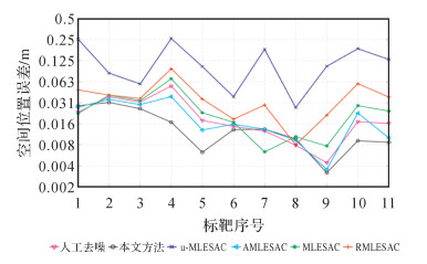 式中,Err3d表示空间位置误差;Errx、Erry和Errz分别为3个坐标轴误差,然后与现有方法进行对比分析。其中,“人工去噪”是人工交互删除噪声后,使用最小二乘估计法拟合球形标靶中心坐标,然后统计空间位置残差所得。如图 7所示,本文方法的空间位置误差整体上明显低于现有算法及人工去噪后拟合计算的中心位置误差,尤其是第5、9、10和11个标靶都在1.0 cm以内,u-MLESAC算法精度最低,误差都在2.0 cm以上。