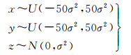 式中,σ取为1.0。噪声通过随机数方式确定分布在平面两侧的点个数,其坐标服从