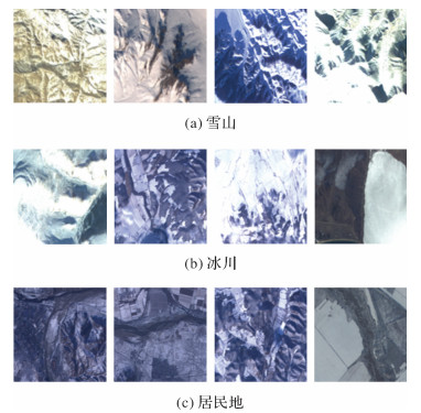 1 试验数据 1.1 原始数据本文的研究对象是高原地区,研究数据来自天绘一号卫星2018—2019年拍摄的中国高原地区RGB彩色遥感影像。考虑到不同地表类型、不同海拔高度以及不同时间段影像特征不同,为保证模型的泛化能力,选取涵盖不同下垫面、不同季节、不同时段的遥感影像共900景。地理经纬度范围为28°35′E—125°35′E,8°25′N—65°25′N,涵盖了高山、城镇、冰川、雪地等不同下垫面情况。典型的影像类型如图 1所示。