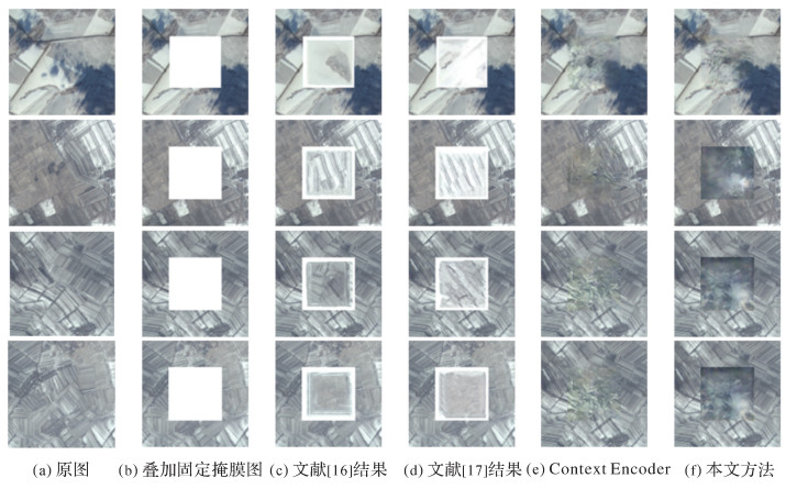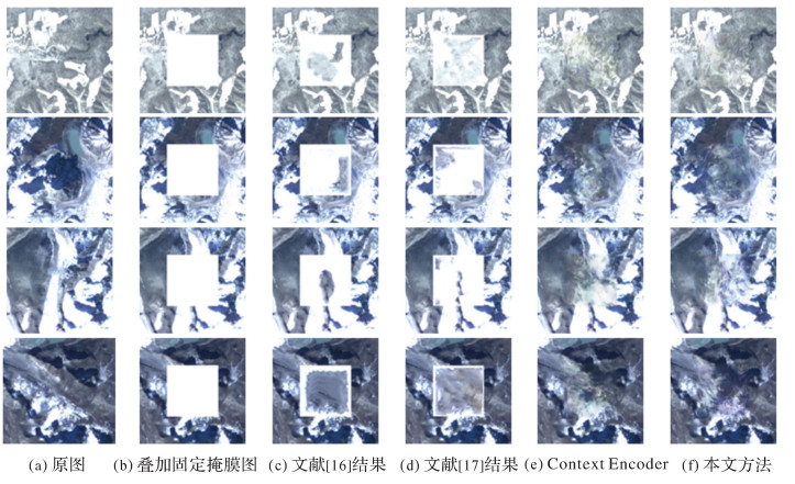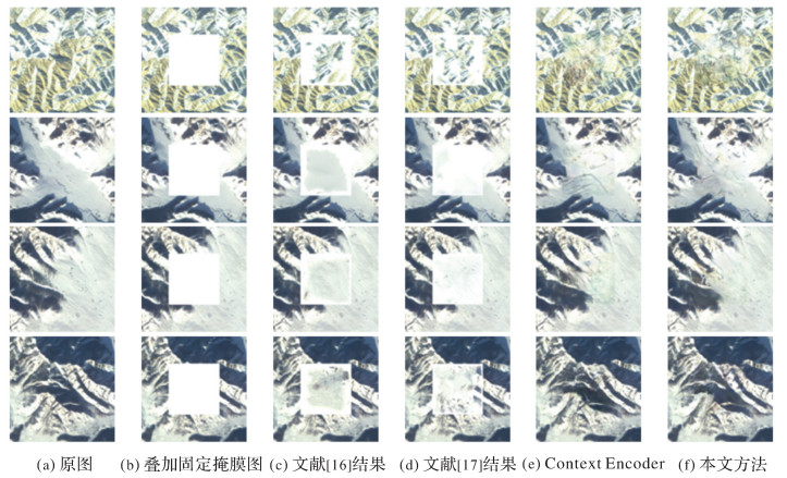 4 结论长期以来,遥感影像去云是遥感图像处理的研究热点。本文针对高原高寒地区天绘一号卫星遥感影像的去云处理,提出了一种DCLS-GAN去云方法,将卫星影像去云和图像修复联系起来,基于深度卷积对抗生成网络对云覆盖区域进行修复。在原始的DC-GAN中引入联合最小二乘与交叉熵对抗损失的联合损失函数,生成网络基于Encoder-Decoder结构,鉴别网络基于CNN,生成的结果经过双线性插值处理后再经过泊松图像编辑后处理,在天绘一号卫星高原地区影像数据集上得到的去云结果在目视效果与定量评价指标与算法耗时上都取得了良好成绩。试验结果表明:相比传统非深度学习图像修复方法与原始Context Encoder网络,本文提出的DCLS-GAN模型能够有效学习数据集的特征分布,联合损失函数有助于提高去云重建的精度,泊松图像后处理有助于平滑图像,减少云区边缘的伪迹、调整色彩分布,为高原高寒地区云雪混杂影像的去云处理提供了新的路径。