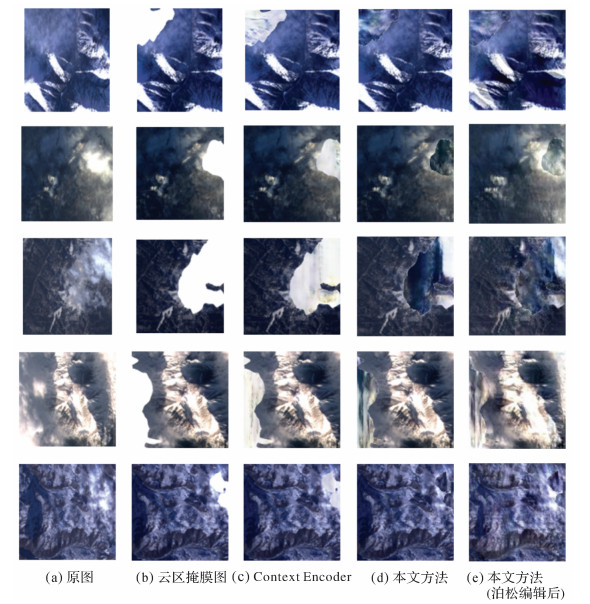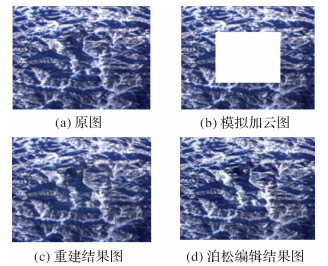 将模拟加云的测试影像输入训练好的DCLS-GAN模型,得到初步去云结果,但生成的去云影像会在背景和边界部分产生一些颜色差异和伪迹。本文采用泊松图像编辑作为后处理方法,处理结果如图 7所示。可见,泊松图像编辑可以有效去除重建区域内部的对比度不一致以及重建区域与原图拼接缝的伪迹问题。