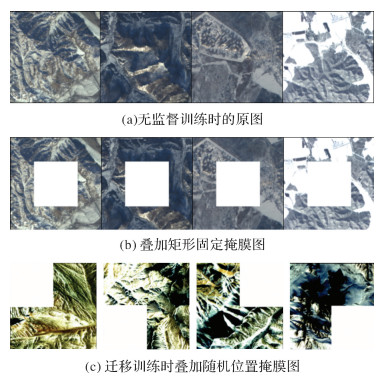 (3) 影像掩膜。在无监督预训练时使用白色矩形中心掩模模拟云覆盖区域[13],掩膜大小为影像长宽的一半,训练模型修复影像中间部分的信息,如图 2(b)所示;在迁移训练时使用可移动云掩膜(不超过影像面积的一半),重点提升模型修复图像边缘信息的能力,如图 2(c)所示。