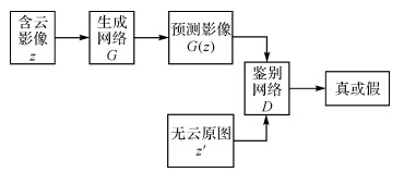 GAN的网络训练是二元极小极大博弈的过程,鉴别网络D不断学习真实无云影像和生成网络生成的假图像之间的区别并区分真假,而生成网络不断学习真实图像的特征分布从而产生逼真图像去欺骗鉴别网络,如(1)式所示