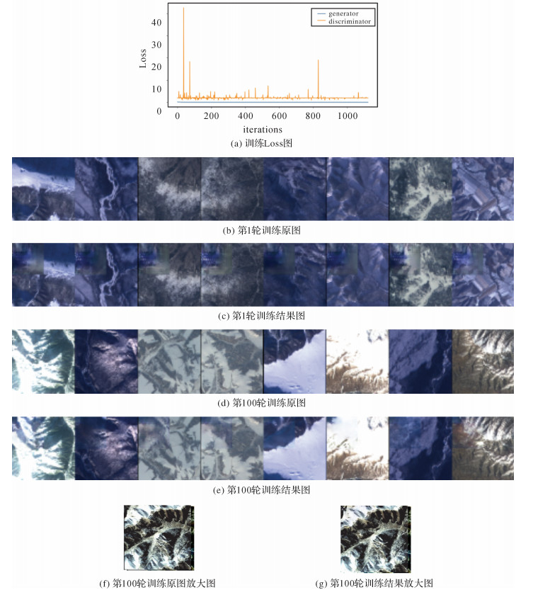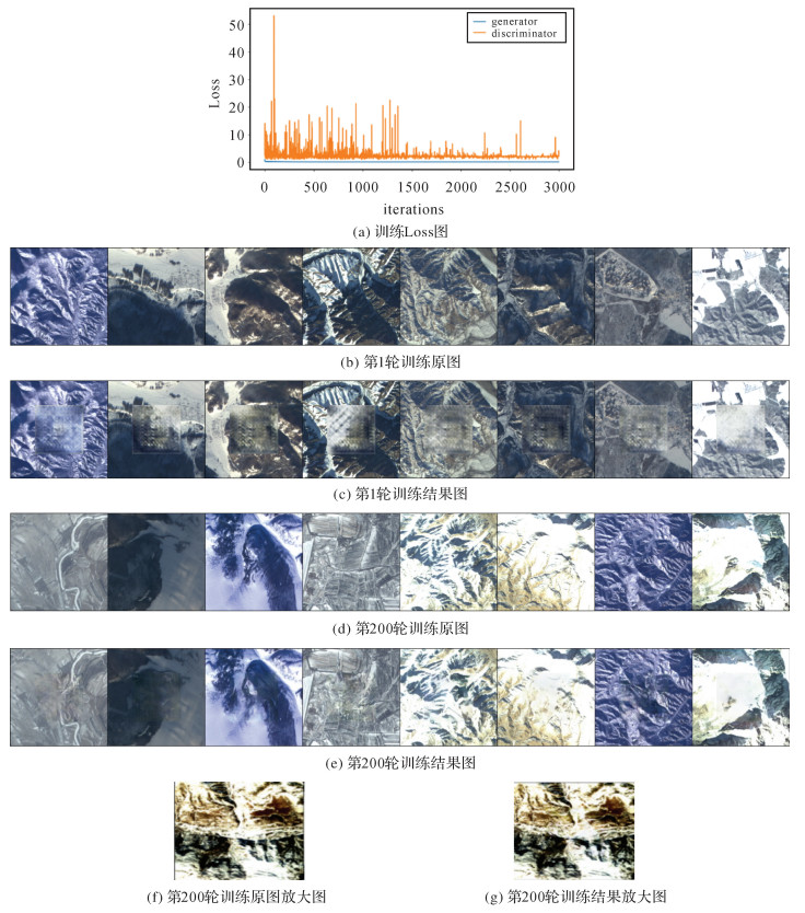 图 5为无监督训练过程与结果,图 5(a)为生成网络与鉴别网络的损失图,图 5(b)为第1轮输入影像,图 5(c)是第1轮训练的生成影像,图 5(d)为第200轮训练时的输入影像,图 5(f)为第200轮训练的生成影像。可见,训练初始阶段,影像修复质量较差;训练200轮后,修复质量已明显提高,但此时网络倾向于学习中心掩膜边界附近的低层次特征,生成网络对影像四周的特征利用不够,仍具有边界伪迹。图 5(g)为训练200轮的结果局部放大(修复部分位于影像中央),此时人眼已难辨认生成影像与原始影像的真假。随着训练次数的增加,鉴别网络判别真假样本的能力越来越强而生成网络的预测结果越来越接近真实样本。