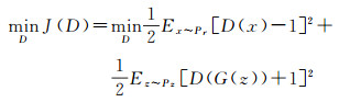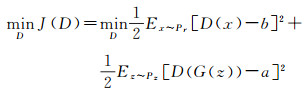针对GAN训练过程过于自由而导致梯度消失或梯度爆炸等问题,许多学者提出了改进的方法。文献[23]提出WGAN模型,利用W距离代替JS散度并加入梯度惩罚来描述两个分布之间的距离,文献[18]提出了LS-GAN,利用最小二乘损失描述两个分布之间的距离,能够在两个数据分布距离较远的情况下仍能反映距离的远近程度,防止因为Sigmoid损失处于饱和状态以及JS散度为常数而导致的梯度为0的情况,解决训练的稳定性问题,提高GAN生成图像的质量。鉴别网络与生成网络的最小二乘损失函数如式(2)、式(3)所示