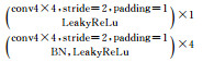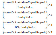 鉴别网络基于CNN结构,由6个卷积层组成,负责判断生成的图像真伪。考虑到池化操作会造成特征信息的丢失,本文在生成网络、鉴别网络中使用空洞卷积替换(Multi-scale context aggregation by dilated convolutions.arXiv preprint arXiv: 1511.07122, 2015)池化,在扩大感受野的同时不丢失图像的细节信息;利用BN操作使特征输出归一化,加速训练并使得网络训练更稳定,但是文献[13]指出,在网络所有层都加上BN会使训练过程震荡,在生成网络G的输出层不使用BN能有效避免该问题,本文采用了这一策略。鉴别网络中的激活函数LeakyReLu,将输出层最后的Sigmoid激活函数[22]结合到交叉熵损失中用防止梯度消失。鉴别网络的参数设置如表 2所示。