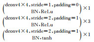 生成网络基于编码器-解码器结构,编码器由5个卷积层组成,解码器由5个转置卷积层组成,负责提取原图特征并生成预测图。表 1给出了生成网络的详细配置,其中conv、dconv、BN、stride和padding分别代表卷积、转置卷积、批标准化、卷积步长和卷积核填0,conv4×4表示卷积核的大小为4×4,同理dconv4×4表示相同大小的核进行转置卷积,连接编码器与解码器的是与通道等宽的全连接层,并使用了步长为1的卷积模块,用于减少网络参数数量,其输入维度为8,输出维度为4000,ReLu[20]、tanh和Leaky ReLu[21]代表激活函数。