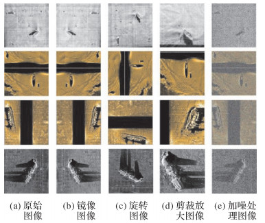 机器学习的目的是得到可以泛化的模型,深度学习模型自主学习特征的能力依赖于大量的训练数据,图像特征越好,模型学习效率越高,效果越好。样本越少,特征信息价值越重要。为了扩充海底沉船图像数据集,获取明显的特征,本文采用数据增强方式,主要包括图像多尺度剪裁放大、图像平移、图像旋转、图像镜像、图像加噪等,为了保证图像目标的完整性和有效性,剪裁的方式采用手动操作。通过数据增强将输入的1000张图片扩充到5000张,其中训练集中的800张扩充到4000张,测试集中的200张扩充到1000张。部分数据增强后的图像如图 1所示,其中最左列为原始图像,往右依次为镜像、旋转、剪裁放大和加噪处理后的图像。
