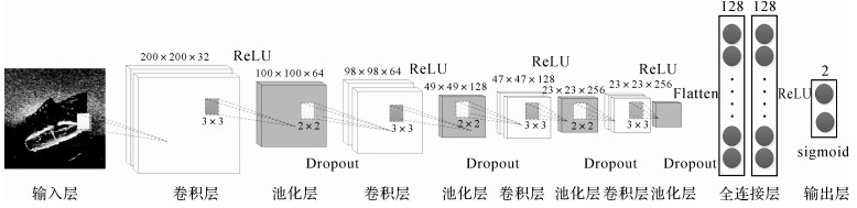 为了适应海底沉船数据样本少的特点,同时考虑到训练精度和训练效率因素,在VGG-16模型的基础上进行了改进,首先简化了模型结构,构建一个由8个卷积层、4个池化层、2个基于激活函数ReLU的全连接层和1个Sigmoid输出层组成的卷积神经网络模型。如图 2所示。