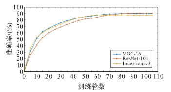 图 5显示了3种模型的训练结果,横轴为训练轮数(epoch),纵轴为模型在验证集上的准确率。从图中可以看出,3个模型的准确率均随着训练轮数的增加而不断上升,其中,VGG-16模型最终的识别准确率虽然略低于ResNet-101模型,但是模型的训练效率明显更高;VGG-16模型的训练效率虽然略有不如Inception-v3模型,但是最终的识别准确率明显更高。