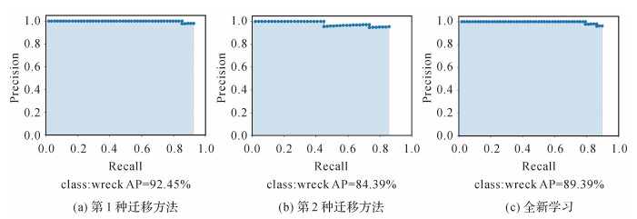 第1种迁移学习方法、第2种迁移学习方法和全新学习的AP值及P-R曲线如图 6所示。第1种迁移学习方法的AP值最高为92.45%,分别比第2种迁移学习方法和全新学习高了8.06%和3.06%,且模型在查全率达到93%的情况下查准率达到98%。而第2种迁移学习方法的识别性能在查准率95%的情况下查全率仅为86%,各项指标都不如全新学习,证明第1种迁移学习方法识别效果性能更佳。