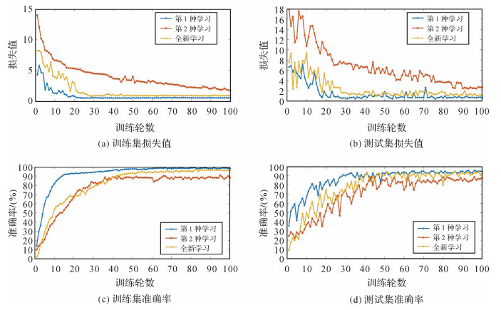 由图 7(b)训练与测试准确率可以看出,3种学习方法的训练初始阶段的准确率分别为14.41%、10.03%和2.31%,在测试初始阶段分别为35.53%、24.58%和8.83%。两种迁移学习方法在初始阶段的识别准确率要明显高于全新学习方法,证明了迁移学习在模型建立之初便拥有了一定的识别能力,其中第1种学习方法的效果最佳。另外,在迁移学习的基础之上,第1种方法在训练集上快速学习,在经过15步之后就达到90%的识别准确率,40步之后便趋于收敛,达到了97%左右的识别准确率,而全新学习在训练了60步之后模型才趋于稳定,识别准确率为95%左右。第1种学习方式在测试集上经过55步训练模型达到收敛,识别准确率达到93%左右,而全新学习在测试集上训练了60步之后趋于稳定,且波动幅度较大,准确率低于第1种方法,达到90%左右。第2种迁移学习方法虽然在初始识别准确率上要高于全新学习,但是模型的整体学习效率不高,训练集在训练了65步之后才达到收敛,且最终的识别准确率为88.03%,低于全新学习的95.14%。在测试集上,第2种学习方式识别准确率波动幅度较大,模型难以达到收敛,在70步之后才趋于稳定,仅达到84.49%,低于全新学习的90.58%。