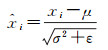 式中,Xi表示该样本中第i个像素点的值;n表示该像素点的总数;μ表示均值;σ表示方差。归一化函数如式(3)所示