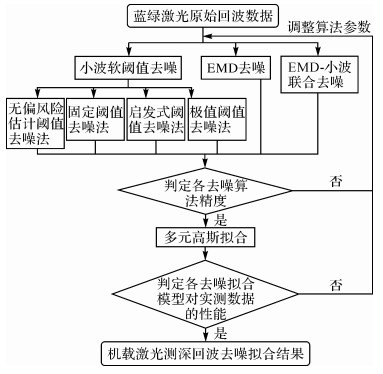 波形去噪是机载激光测深数据处理的关键步骤,本文对小波软阈值去噪法、EMD去噪法,与联合去噪法进行对比试验,反复调节各试验参数以达到最佳去噪效果。再利用实测数据进行去噪拟合,从而对去噪算法的实际效果做出评判。流程如图 2所示。