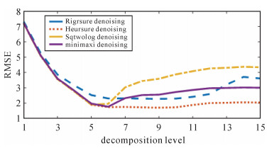 由于小波分解层级是影响去噪效果的主要参数之一,因此,本文通过逐一增加分解层数来找到最佳去噪分解层,其去噪精度好坏利用均方根差(RMSE)进行判断