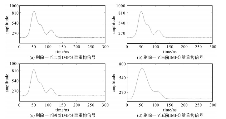 从图 6可以看出:将一阶和二阶IMF剔除后信号中仍然存在较大噪声,逐一剔除一至四阶IMF分量后,原始回波信号噪声得到了一定抑制,而剔除前五阶IMF后重构回波信号开始出现信号失真,图 6中的图(d)出现了较大偏差。故将一阶IMF作为纯噪声剔除,二至四阶IMF分量可看作噪声与信号的过渡层根据数据采集量的大小作适当筛选,五阶之后的IMF分量作为有效信号回波予以保留。