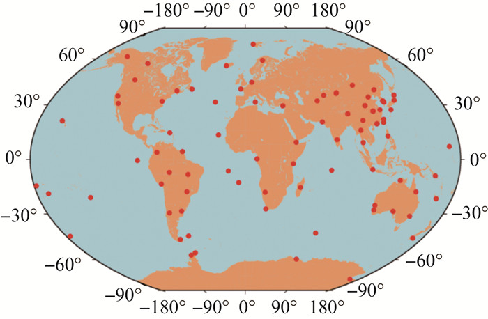 | 图 1 选取的全球GNSS检测站分布 Fig. 1 Distribution of the selected GNSS checking stations |