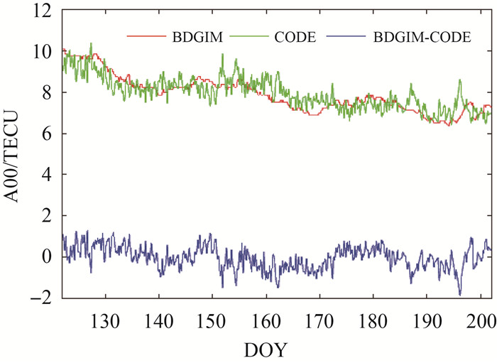 (4) BDGIM模型发播参数与CODE发布的球谐系数对比。采用球谐函数模型拟合全球电离层TEC时,球谐函数的阶次代表电离层TEC在全球范围内的分辨率,不同阶次的系数代表着不同频率信号对合成信号的贡献大小,其中全球电离层TEC的平均值可以由第一项球谐系数表示[31]。BDGIM模型与CODE均采用球谐函数作为TEC拟合函数,二者区别在于采用的球谐阶次和系数的更新时间。BDGIM采用9个球谐系数,每2h更新一组,CODE采用阶次为15阶×15阶的球谐系数,每1h更新一组。通过对比BDGIM模型发播参数与CODE发布的球谐系数,可以一定程度地了解BDGIM对全球电离层TEC的总体描述能力。
