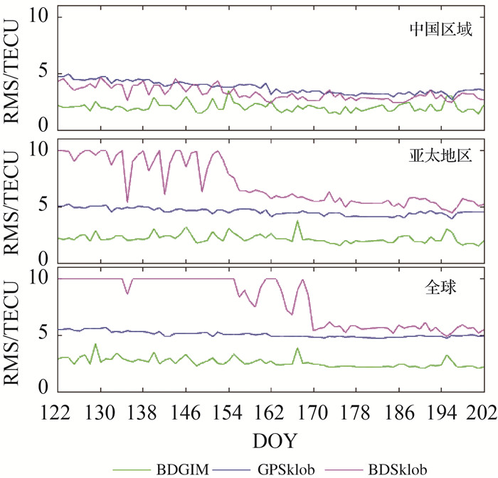 | 图 2 2020年DOY 122-DOY 202不同电离层模型TEC计算值与IGSGIM相比的RMS时间序列 Fig. 2 Time series of the RMS of the TEC differences betweenmodel estimates and the IGSGIM during the period from DOY 122 to DOY 202 in 2020 |