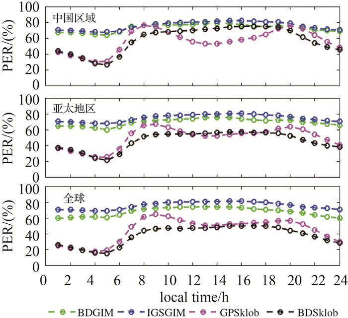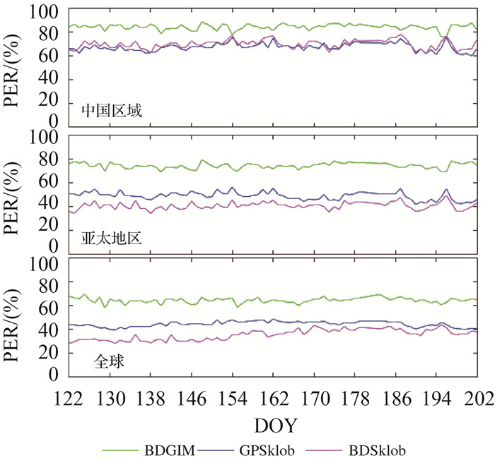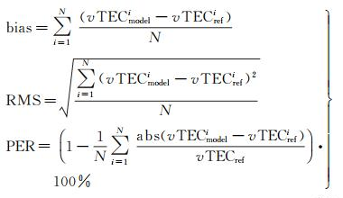 2.2 主要精度评定指标目前,通常使用的电离层时延模型改正精度的评价指标,主要包括不同电离层模型的TEC计算值与电离层TEC参考值之间的平均偏差(bias)、均方根(RMS)及修正百分比(PER) 3种,具体计算见式(9)。其中,bias与RMS分别表示基于电离层时延修正模型计算的电离层TEC与参考电离层TEC差值的平均值及均方根;PER表示电离层时延修正模型相对于电离层TEC参考值的修正百分比。bias与RMS为绝对精度指标,PER为相对精度指标。