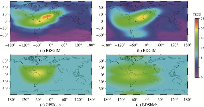 | 图 4 不同电离层模型计算的全球TEC分布 Fig. 4 Distribution of global TEC calculated by different ionospheric models |