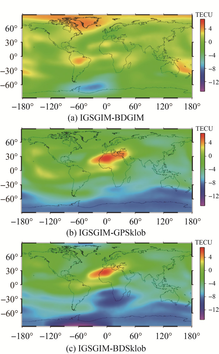 | 图 5 不同电离层模型计算的TEC与IGSGIM产品的差异 Fig. 5 Distribution of the differences of the TEC estimates obtained from different ionospheric models and those from IGSGIM |