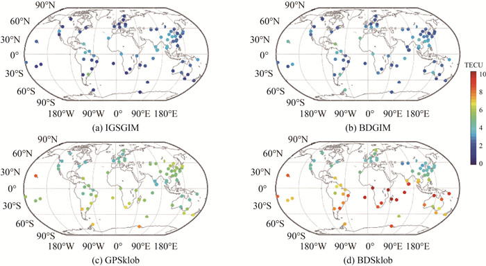利用选取的83个检测站实测BDS和GPS数据获取的电离层TEC,评估BDGIM模型的修正精度。图 6给出了2020年DOY 122不同电离层模型在全球各检测站TEC计算值与实测TEC相比的RMS值。IGSGIM、BDGIM、GPSklob及BDSklob在中国区域的电离层延迟改正精度分别为2.73、2.70、4.82和4.52 TECU,在亚太地区的电离层延迟改正精度分别为2.58、2.62、4.85和5.14 TECU。可以看出,除IGSGIM产品外,BDGIM模型计算的电离层TEC在与选取的各全球检测站计算的电离层TEC的差值的RMS均最小,明显小于GPSklob模型和BDSklob模型相应的同类计算结果。