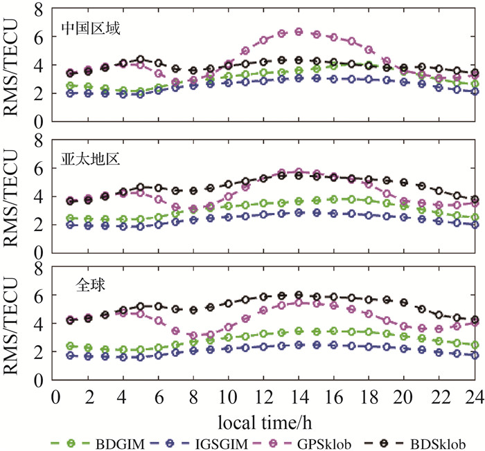| 图 7 2020年DOY 122-DOY 202不同电离层模型TEC计算值与实测TEC相比的RMS随地方时变化 Fig. 7 RMS of the differences between model TEC estimates and the measured TEC at different local time bins during the period from DOY 122 to DOY 202 in 2020 |
