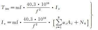 式中,Tion表示卫星与接收机视线方向的电离层延迟改正值,单位为m;mf表示电离层投影函数,用于垂向TEC(VTEC,Iv)和斜向电离层TEC(STEC)之间的转换,其计算公式见式(2);f表示当前信号对应的载波频率;αi(i=1~9)表示BDGIM模型的播发参数,由区域/全球北斗监测站数据计算得到,单位为TECU;Ai(i=1~9)表示根据电离层穿刺点位置及观测时刻计算得到的数值,其计算公式见式(3);N0表示电离层延迟预报值,由固化于用户接收机端的预报系数、电离层穿刺点位置及观测时刻计算得到,单位为TECU,其计算公式为