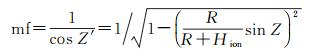 式中,mf表示余弦函数投影函数;R表示地球半径,取值为6378km;Hion表示电离层薄层高度,取值为400km;Z′表示电离层穿刺点处的卫星天顶距;Z表示接收机位置处的卫星天顶距。