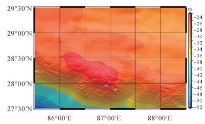 | 图 2 珠峰区域重力似大地水准面模型(蓝色三角形表示珠峰) Fig. 2 Gravimetric quasigeoid model in the area of Mount Qomolangma |