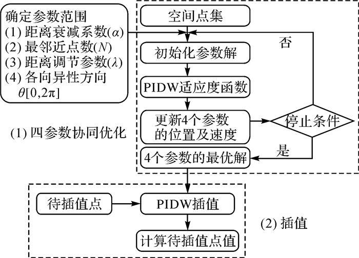 1 PIDW算法PIDW是一种顾及各向异性的IDW插值的改进模型,通过引入距离及方向调节参数来描述空间点间各向异性的邻近性关系,并利用粒子群优化算法实现模型的多参数协同优化。图 1是PIDW方法的主要流程,其算法主要包括四参数协同优化以及插值两大过程。