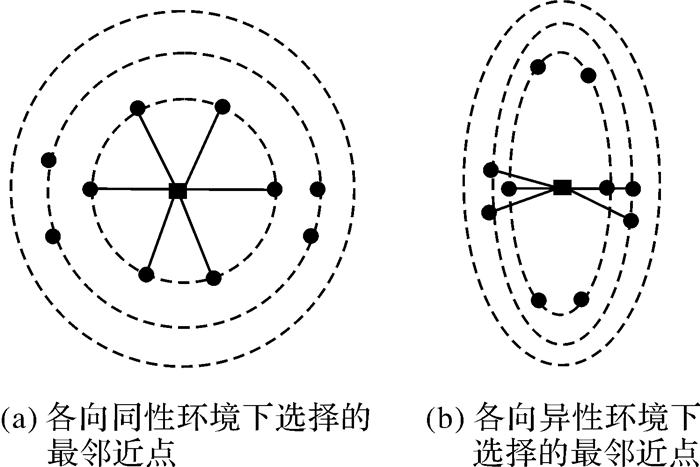 | 图 2 各向同性与各向异性环境下最邻近点的选择 Fig. 2 Illustration of the different selection of proximity points in the cases of isotropic and anisotropic assumptions |