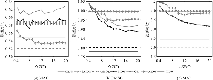 从图 4(a)可以发现:CIDW与FIDW插值算法的MAE随着插值点数的增多呈现震荡式变化,并且FIDW的MAE显著低于CIDW;KAIDW、AIDW与FIDW的MAE大致保持一致,但OK和PIDW的MAE显著低于KAIDW、AIDW、FIDW和CIDW;OK的MAE低于PIDW,但最大偏差仅为0.007℃;AnisOK的MAE误差为0.52,低于PIDW的0.54。由图 4(b)中可以看出:CIDW、FIDW和OK的RMSE随着点数的增多而下降,在参考点数量为13以上时趋于稳定;OK的RMSE稍好于AIDW与KAIDW方法,但劣于CIDW和FIDW算法;AnisOK的RMSE误差显著低于CIDW、FIDW、OK、AIDW、KAIDW;PIDW的RMSE为0.78℃,比次优的AnisOK方法低0.02℃。图 4(c)中的MAX反映了与RMSE类似的规律:CIDW与FIDW插值算法随着点数的增多稳步下降,其中FIDW的MAX略低于CIDW,而AIDW与KAIDW的MAX表现最差;OK的MAX总体上优于AIDW和KAIDW,但明显差于CIDW和FIDW算法;PIDW的MAX显著低于CIDW、FIDW、AIDW、KAIDW以及OK;AnisOK的MAX具备一定的优势,相较于次优的PIDW方法,其最大值误差还要低0.4℃。