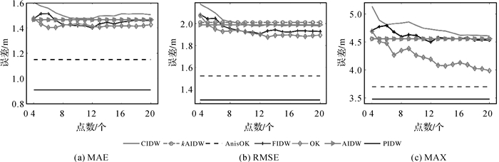 从图 5(a)中可以发现:随着插值点数的增多,CIDW、FIDW与OK的MAE逐渐下降,在采样点为12时达到最低,分别为1.43、1.37和1.42 m;AIDW与KAIDW的MAE低于CIDW算法,但大于其余3种算法;AnisOK的MAE误差明显低于CIDW、FIDW、OK、AIDW及KAIDW;PIDW表现出明显的优势,其MAE在7种插值算法中的误差最小,比次优AnisOK的最小MAE值再少27.3 cm。图 5(b)中的RMSE表现出类似的结果:CIDW、FIDW和OK的RMSE随着点数的增多呈现下降,在样点为14以上时基本达到稳定状态,并且OK的RMSE值最小;AIDW与KAIDW的RMSE的结果最差;AnisOK的RMSE低于除PIDW外的5种插值方法;PIDW的RMSE指标在所有算法中同样呈现出明显的优势,比次优的AnisOK低27 cm左右。图 5(c)表明CIDW、FIDW与OK的MAX随着点数增多而呈现下降趋势,在参考点达到17以上基本保持稳定;AIDW和KAIDW比CIDW与FIDW能够取得更优的效果,但PIDW的MAX显著优于其他插值方法。总结以上两个试验结果,可得出以下结论:①顾及各向异性的AnisOK与PIDW几乎在所有指标中都取得最小的误差,表明在计算过程中顾及各向异性的空间属性,将有助于提高模型的插值精度;②总体上PIDW的插值效果稍好于AnisOK方法,而且PIDW方法对数据无需假设前提,但地统计的AnisOK方法要求数据具有空间的二阶平稳性。