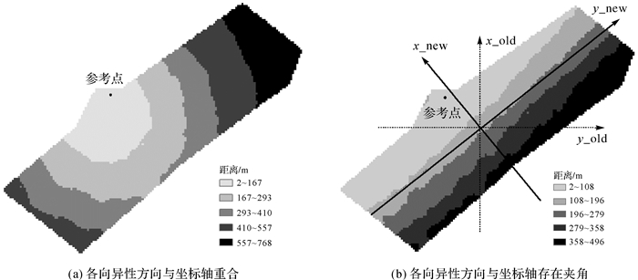 由图 7(a)可知,试验1得到的参考点与其余各样本点之间的距离基本为同心圆模式,不能真实地反映高程变化的空间邻近性,同时试验1得到的CV残差和为2 894.4也再一次证明了其拟合精度较差。试验2得到的CV残差为1 400.4,其计算得到的各向异性方向与原始y轴间的夹角为132.66°(图 7(b))。可以发现,试验2的CV残差和较之于试验1低很多,同时试验2得到的各向异性方向与真实的方向相差仅为2.34°。同时由图 7(b)可知,正确反映各向异性的方向能够得到准确的空间邻近关系。