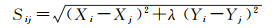 式中,(Xi, Yi)与(Xj, Yj)表示点i与j的笛卡儿坐标。