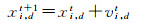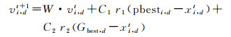 式中,vi, dt+1表示粒子i在第t+1次迭代的第d维分量的速度;xi, dt+1表示粒子i在第t+1次迭代的第d维分量的位置;C1、C2为学习因子与调节学习步长;r1、r2为两个随机变量,取值范围为[0, 1],以增加搜索随机性;W表示惯性权重,调节对解空间的搜索范围。