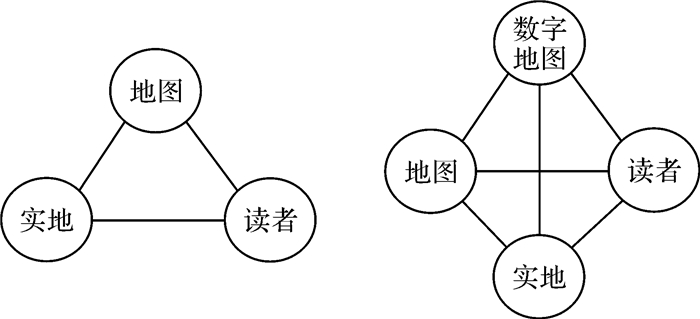 2.1.2 地图学三角形到地图学四面体模型文献[5, 43-45]认为,从地图学角度来定义空间认知,是人们认识自己赖以生存的环境,包括其中的诸事物、现象的相关位置、依存关系以及它们的变化和规律。空间认知是人们对出现于周围环境中的各种事物和现象的存在、变化方式以及它们的相关位置的认识过程和能力;是对事物和现象的发生、影响、因果进行分析研究的基础;是联系地而不是孤立地,发展地而不固定地看待事物和现象的前提。由地图学三角形到地图学四面体的转化,为现代地图学增加了数字地图-地图,数字地图-实地,数字地图-读者3个关系,标志着地图空间认知理论与地图制图技术的发展,反映了信息时代地图学的变革(如图 2所示)。文献[15]继续关注人-机-环境研究,提出了放飞地图的空间认知新思想。