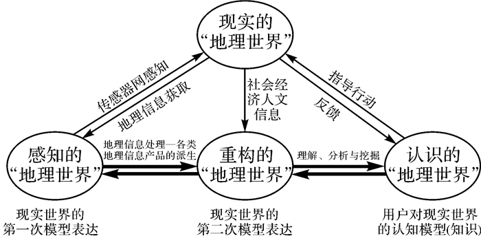 文献[3]认为,空间认知就是研究空间信息处理的过程,或者说是研究人们怎样认识自己赖以生存的环境,包括构成环境的诸事物、现象的相关位置、空间分布、依存关系,以及它们随时间变化的运动演化规律。基于传感器网络由“现实的地理世界”到“感知的地理世界”(包括感知、表象、记忆、思维等一系列过程)、“重构的地理世界”、再到“认知的地理世界”的空间认知概念模型(如图 3所示),为大数据时代的知识制图、智能制图奠定了理论依据[17, 46]。时空大数据时代的到来,使地图空间认知模型向多模式时空综合认知模型转移。